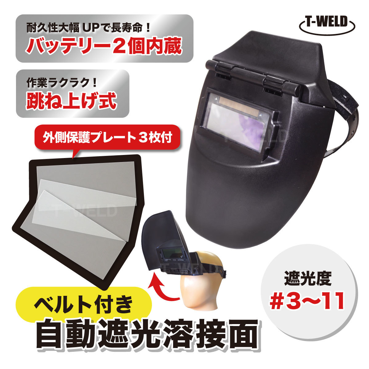 - ベルト付き 自動遮光 溶接面 跳ね上げ式 ( 外側保護プレート 3枚 付き )
