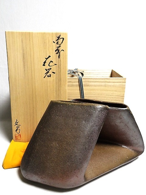 - 備前花入 川端文男 共箱 共布 大きさ約35cm×約18cm 高さ約23cm 備前焼 A27-0131外