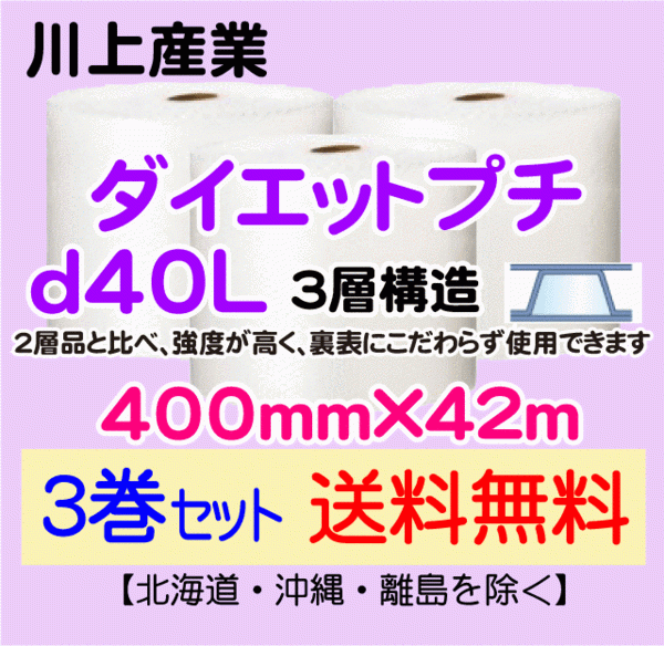 > 【川上産業 直送 3巻set 送料無料】d40L 400mm×42m 3層 エアークッション エアパッキン プチプチ エアキャップ 緩衝材