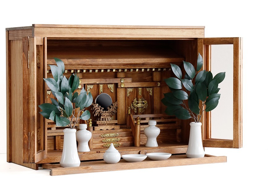 - 神棚セット 箱宮三社 大型 20号 懐古調 家具調 胡桃 せともの神具付 桧製 家具調モダン神棚
