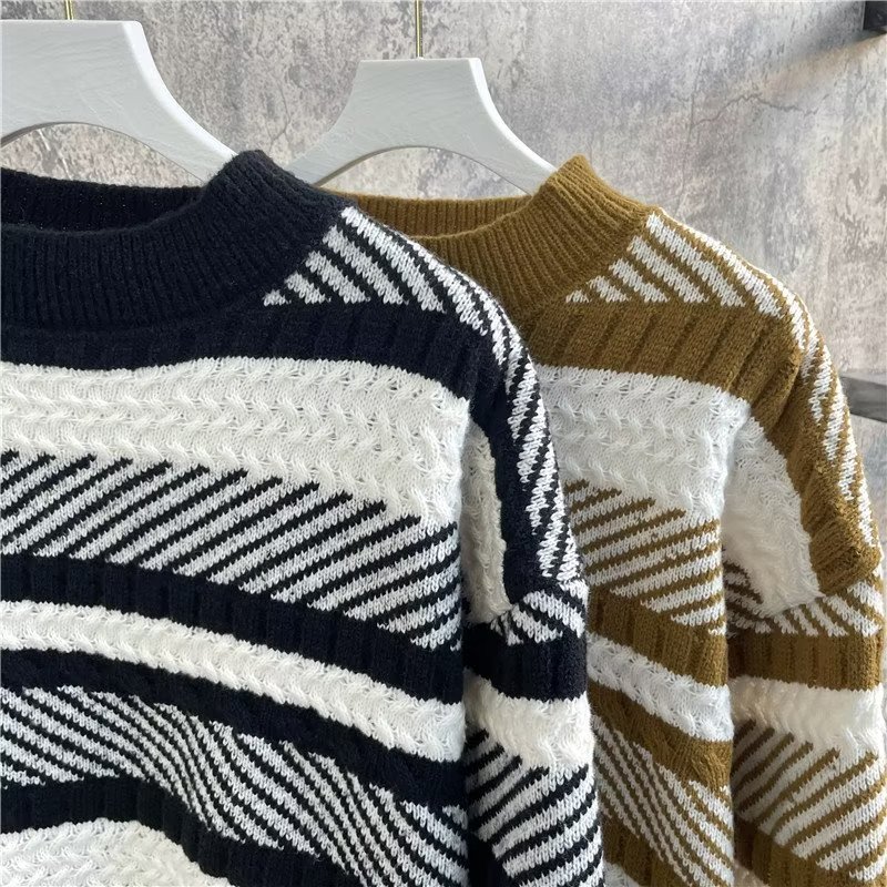 - CJM1329★ゆったり ニット 厚手 カップル服 レトロ ストライプ カラーコントラスト セーター メンズ 秋冬【2色可選】