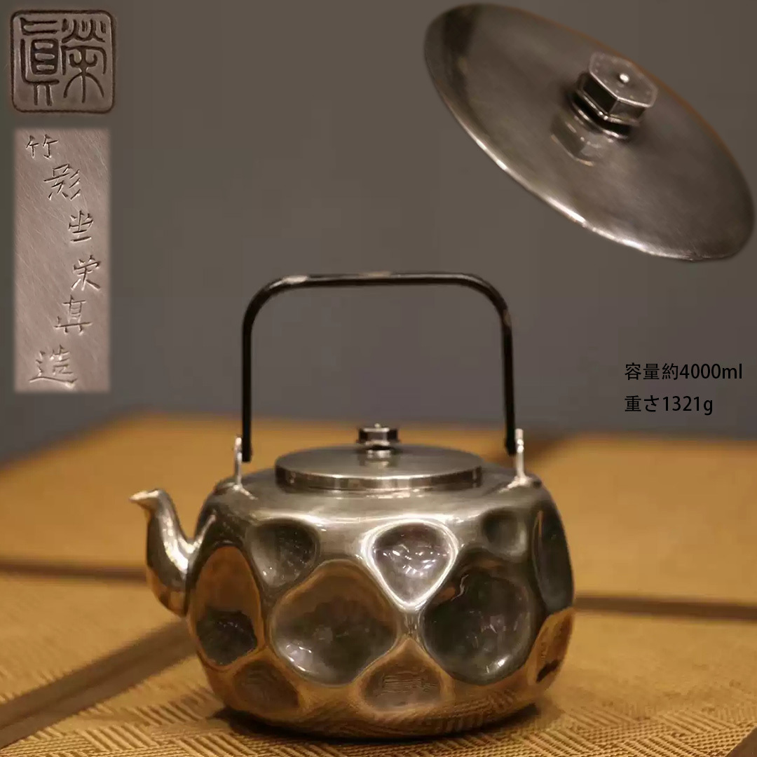 - 古銀 茶壺 竹影堂栄真 造 「純銀大鎚目紋超大提梁壺」 銀瓶 煎茶 湯沸 急須 茶道具 南鐐 金工 茶器 時代物 LT-03251