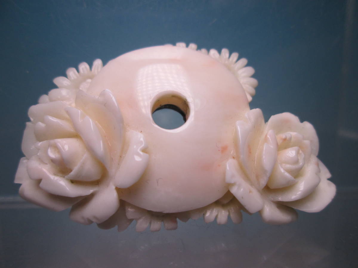 - ☆アンティーク・本珊瑚 円に薔薇の花と菊花彫刻の帯留め 17,33g