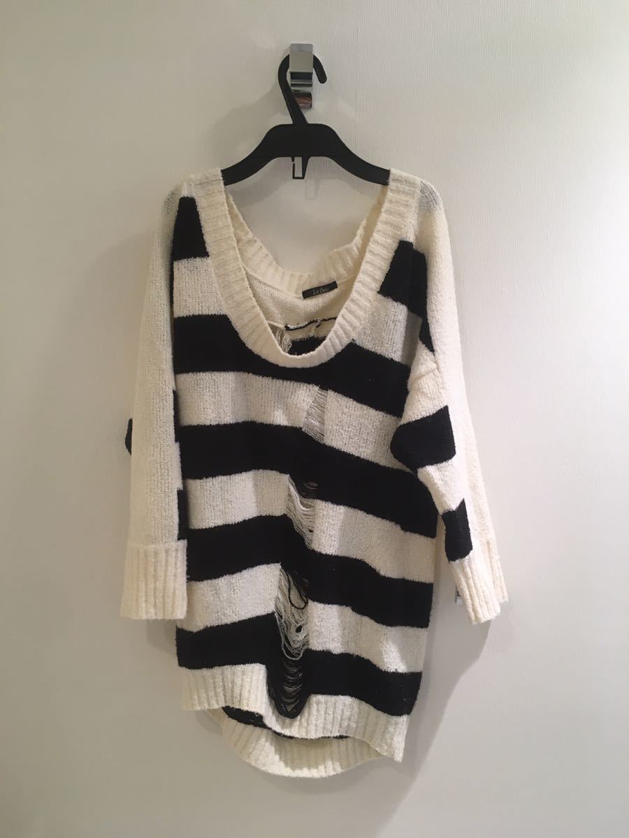 - 黒×白 ボーダー ダメージニット トップス カジュアル パンク 着痩せ 華奢見え