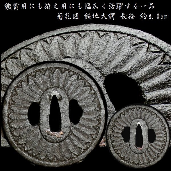 > 【 恵 #0563 】 鑑賞用にも拵え用にも幅広く活躍する一品 菊花図 鉄地 大鍔 長径 約 8.0cm 検:鍔/縁頭/切羽/ハバキ/刀剣/刀装具