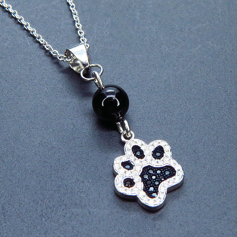 - シルバー925 ジルコンが散りばめられた肉球モチーフとオニキスを組合せた大人可愛いネックレス アジャスター追加可 猫 犬