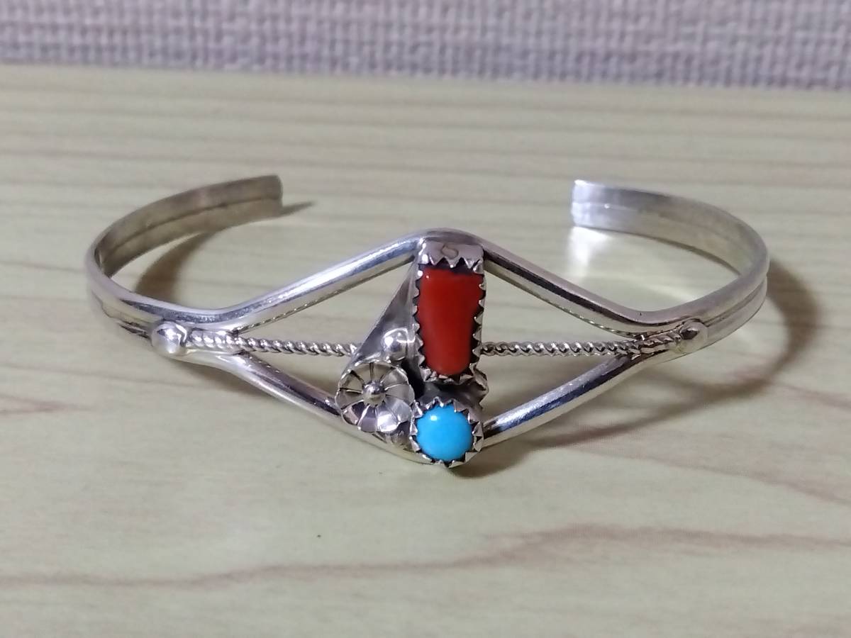 > 未使用 即決!! ¥3900 シルバー925 インディアンジュエリー ターコイズ コーラル バングル USA製