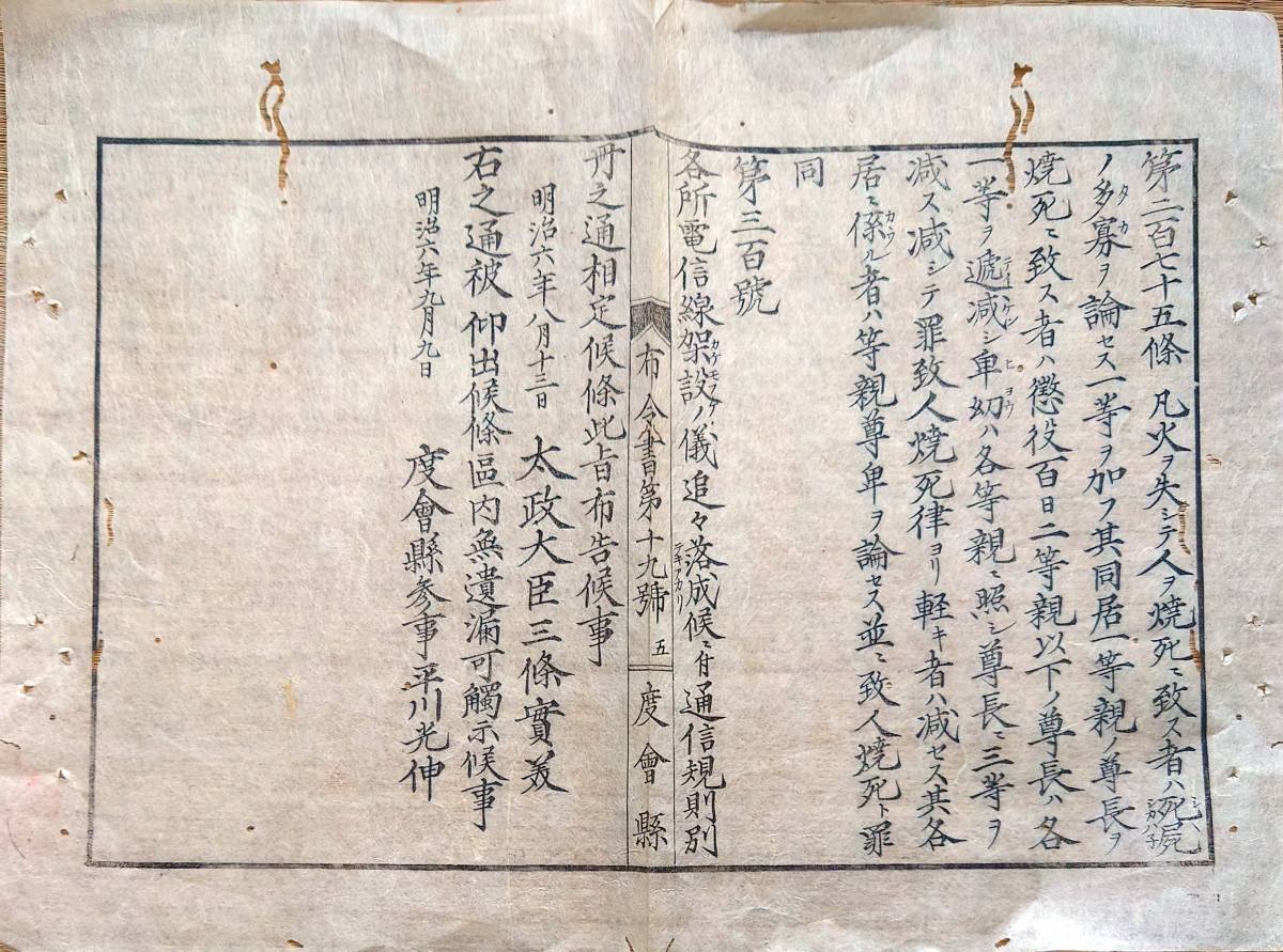 - f23050802〇明治布告布達 人を焼死に致すもの懲役 電信線架設の儀 明治6年 度会県 三重県〇和本 古書 古文書