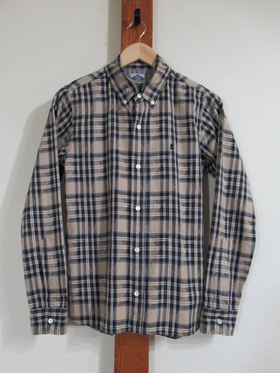 - NAKED SUN/ネイキッドサン▽シャツ コットンツイル チェック ベージュ×ネイビー系 マチ付き 猫目ボタン EGO BRAIN