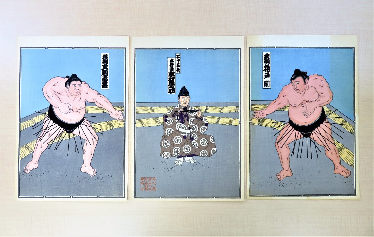 > 次郎画 古太夫書 佐武郎彫 扇令摺『納札五月例会 古式相撲三段構』彩色木版画19枚(錦絵三枚続他)横綱大鵬 柏戸 立行司木村庄之助 千社札
