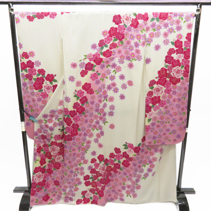 > 【FINAL PRICE】 ★きもの北條★ 振袖 リサイクル 正絹 トールサイズ 銀通し 流麗な薔薇の図 成人式 結婚式 結納 A486-4 L 【中古】