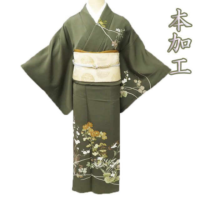 > ★きもの北條★ 特選 本加工 花の図 春秋 紋付 金駒刺繍 風雅な美に満ちた逸品 海松色 着物 訪問着 A792-2 SA 【中古】