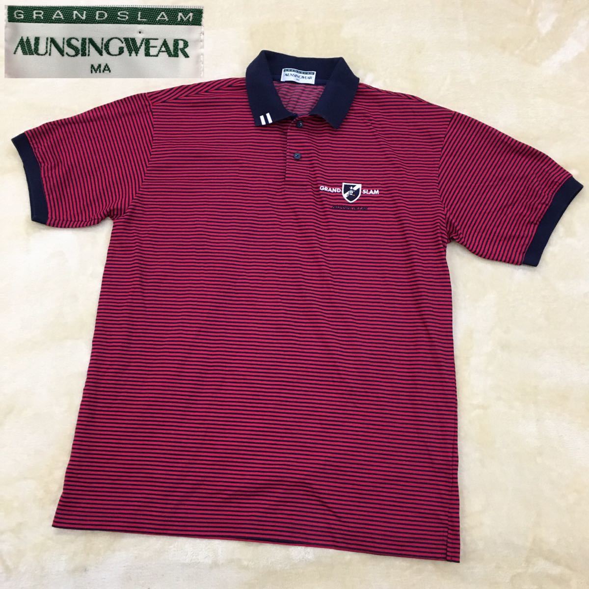 - マンシングウェア グランドスラム ゴルフウェア スポーツ 半袖ポロシャツ ボーダー ペンギン刺繍 メンズ サイズMA デサント