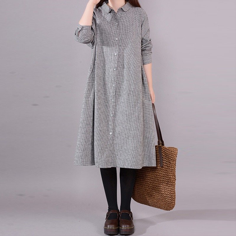 - ZPT411☆新品春細チェック柄オシャレゆったり大きいサイズ長袖ロングシャツワンピース