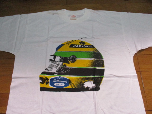 - 希少 即決価格 激レア アイルトン セナ ヘルメット Tシャツ Lサイズ ロゴ 白 F1 タグなし未着用インク汚れ有 当時物