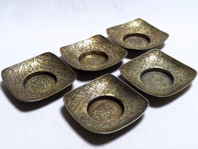 - 茶道具 茶托まとめて5客 竹図 金工細工 煎茶道具