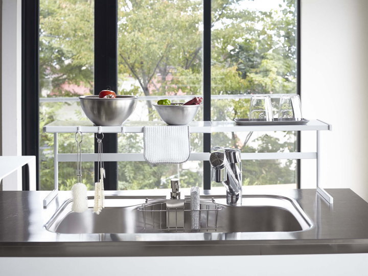 - 伸縮 キッチンサポートラック (ホワイト) フック付き 小物置き 調味料置き キッチン雑貨 シンク上 コンロ奥 山崎実業 タワー