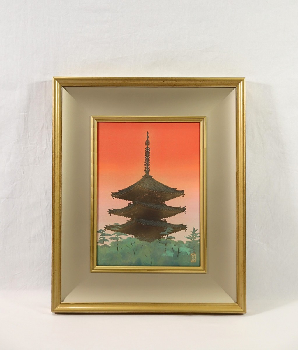- 真作 村居正之 日本画「興福寺夕映」画寸 25cm×34cm 4号 京都府出身 日本芸術院会員 池田遙邨に師事 朱のグラデーションの空と五重塔 7592