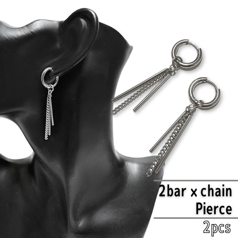 - 2バー×チェーン付き フープピアス シルバー 2個セット 1ペア SET 片耳 男女兼用 ステンレス メンズ レディース チェーン 韓国 韓流