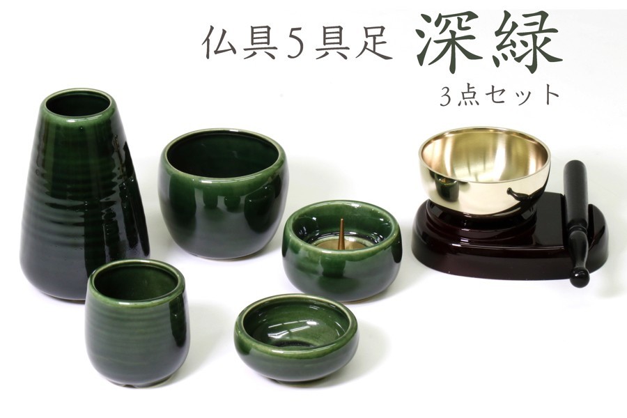 > 国産 仏具 仏具セット ■ 和柄 5点セット + おりん3点 深緑 ■ モダン 家具調 仏壇 お供え ■ 香炉灰付 お盆 お彼岸 お墓参り 供養