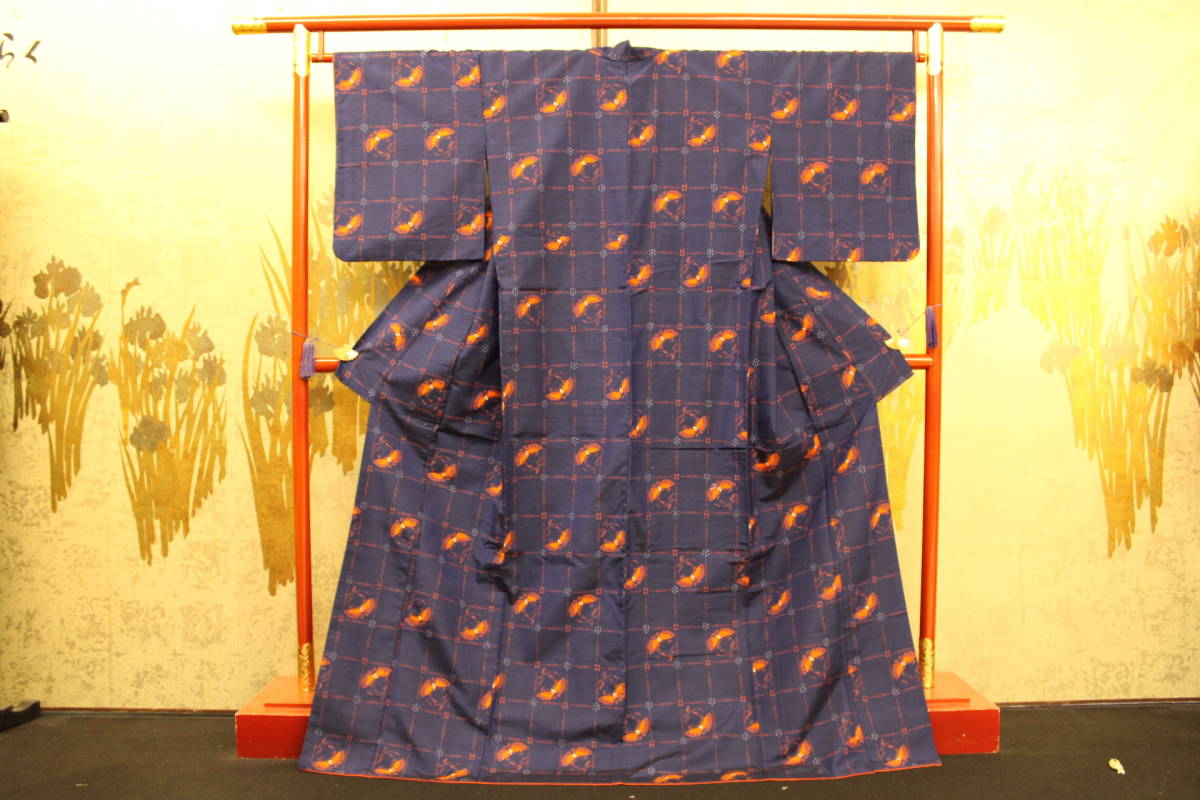 > きもの今昔5439 紬のきもの 広衿袷仕立て 正絹十日町紬 紺色地に朱入りの絣格子に蝶のデザイン 身丈172cm