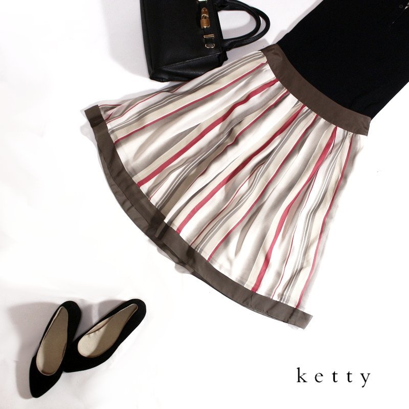 - 美品 ketty ケティ ■ 春 夏 上品 膝下丈 マルチ ストライプ柄 ふんわり シフォンスカート フレアスカート 2 9号 ホワイト 白 グレー 赤