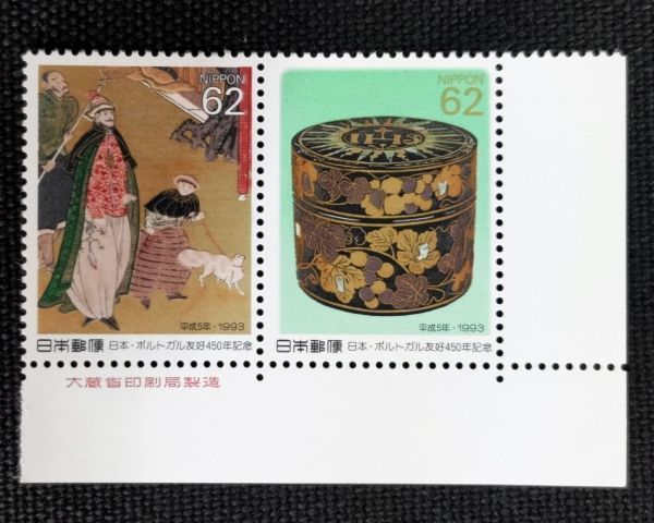 > [23081621]【日本・ポルトガル友好450年記念】2種連刷 銘版付「南蛮人渡来図屏風・葡萄蒔絵螺鈿聖餅箱」62円×2 1993年 美品*