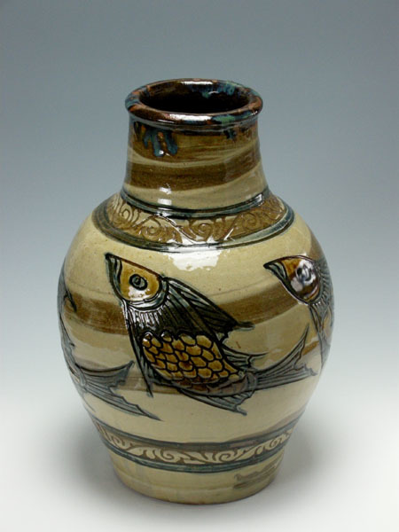 - 琉球壷屋焼 登り窯 金城敏男 作 金城敏男 刷毛目魚文大花瓶