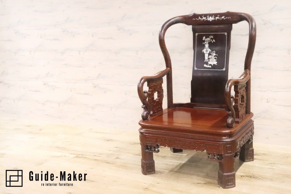 - GMGH205A○中国美術 アームチェア ラウンジチェア 椅子 唐木 天然木 花梨 螺鈿細工 彫刻 最高級