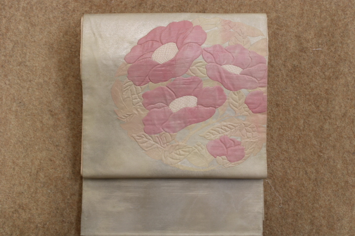 > きもの今昔5743 袋帯 西陣織 正絹引き箔錦織 太鼓と前腹に膨れ織の椿柄 アイボリ地色 帯の長さ429cm