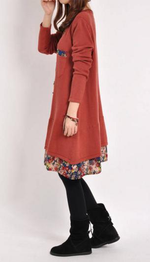 - 7-11.チュニックワンピ 膝丈 ゆったり カジュアル 花柄 レッド XL