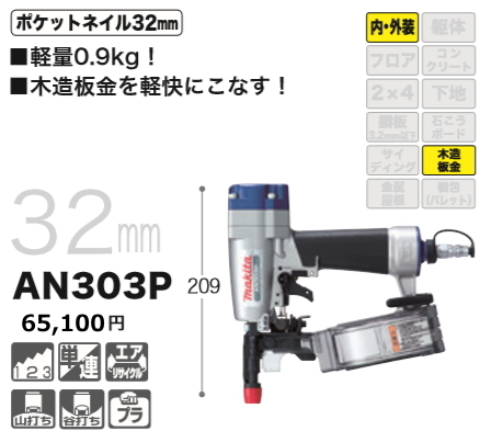 - マキタ 32mmポケットエア釘打 内装ボード用 AN303P 新品