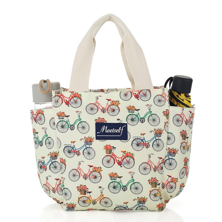 - 自転車柄 ハンドバッグ ファスナー付き バッグ お散歩 お弁当 通勤 通学 多機能 撥水加工 大容量 ランチバッグ 手提げバッグ
