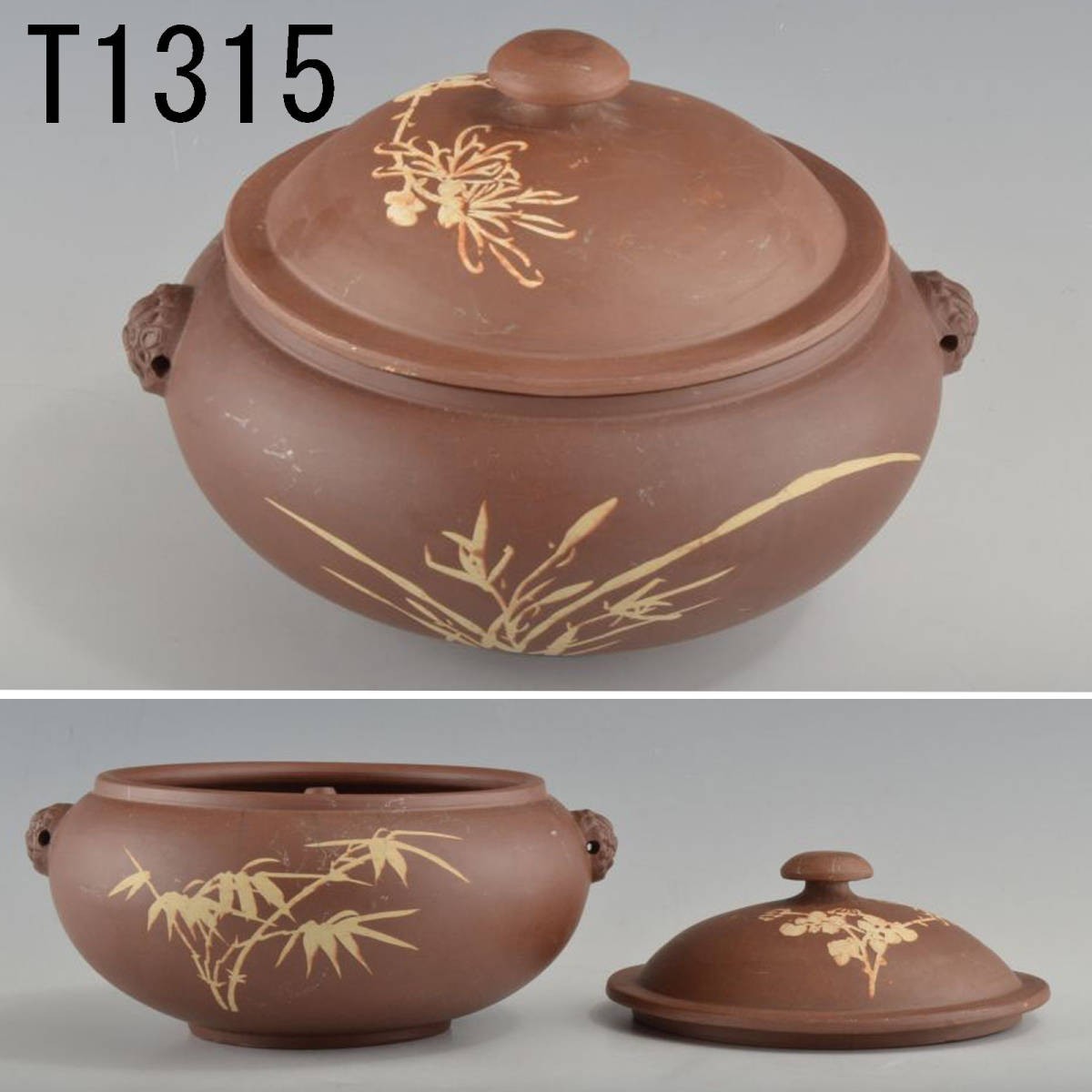 - T01315 中国雲南 朱泥白土象嵌鍋 菊笹蘭模様入:真作