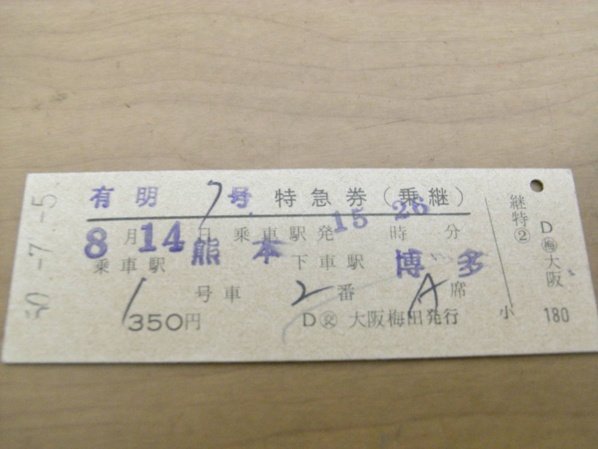 - 雷鳥7号 特急券(乗継) 乗車駅 熊本 下車駅 博多 昭和50年7月5日発行 交 大阪梅田発行