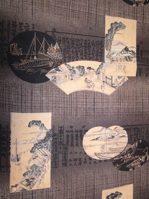- 男5-53★江戸柄*東海道*交織*襦袢*古布はぎれ★一閑張り/襖絵/屏風絵/アンティーク