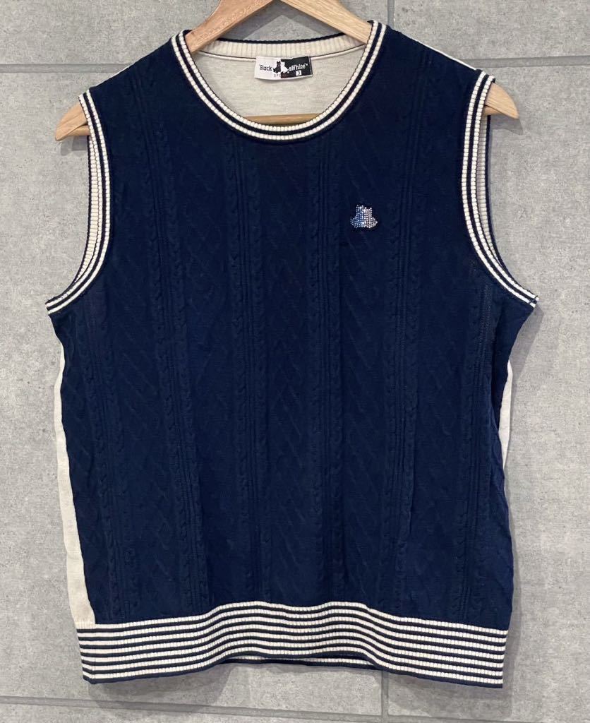 > 超キュート! Black&White ブラックアンドホワイト ウール ニットベスト ロゴラインストーン ネイビー アイボリー 3サイズ ○ 新規×