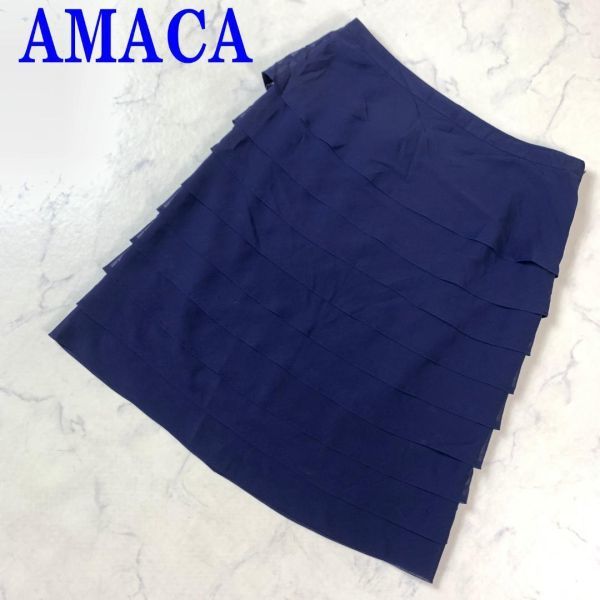 - アマカ ひざ丈スカート ウール ティアード 裏地あり 青 AMACA ブルー 40 C7226