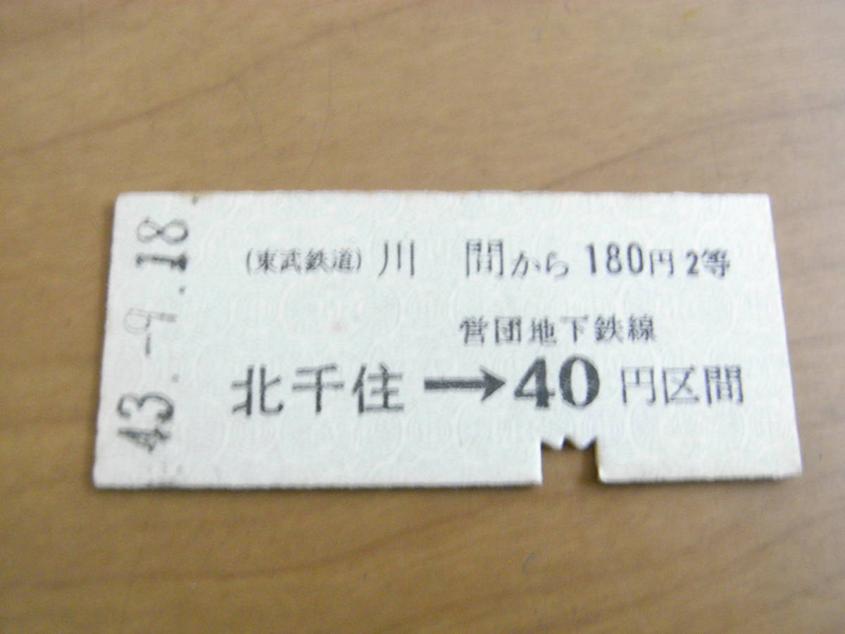 - 東武鉄道営団連絡乗車券 川間から180円2等 北千住→営団地下鉄線40円区間 昭和43年7月18日 川間駅発行