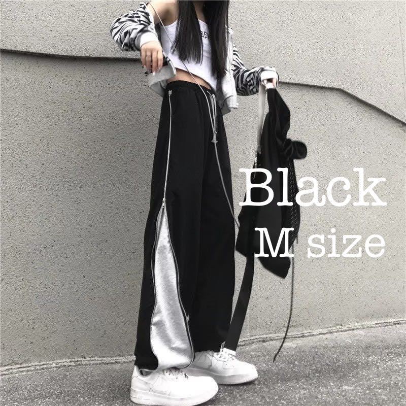 - ボトムス サイドジップ ワイドパンツ イージーパンツ ラインパンツ ユニセックス ダンス 衣装 黒 ブラック M