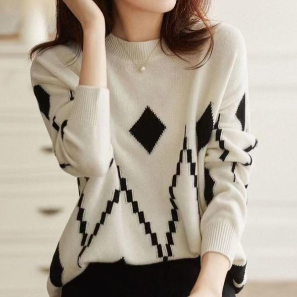 > 新入荷/オシャレ ニットセーター 柔らかい 暖かい ニットトップス 上品 超綺麗 きれいめ チェック柄 長袖 ニットセーター / 白