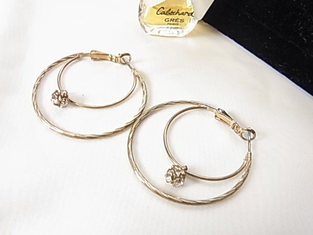 - ビンテージ/ヴィンテージ ラインストーンが1粒輝く フープデザイン 2連 輪っか 金色 ピアス★