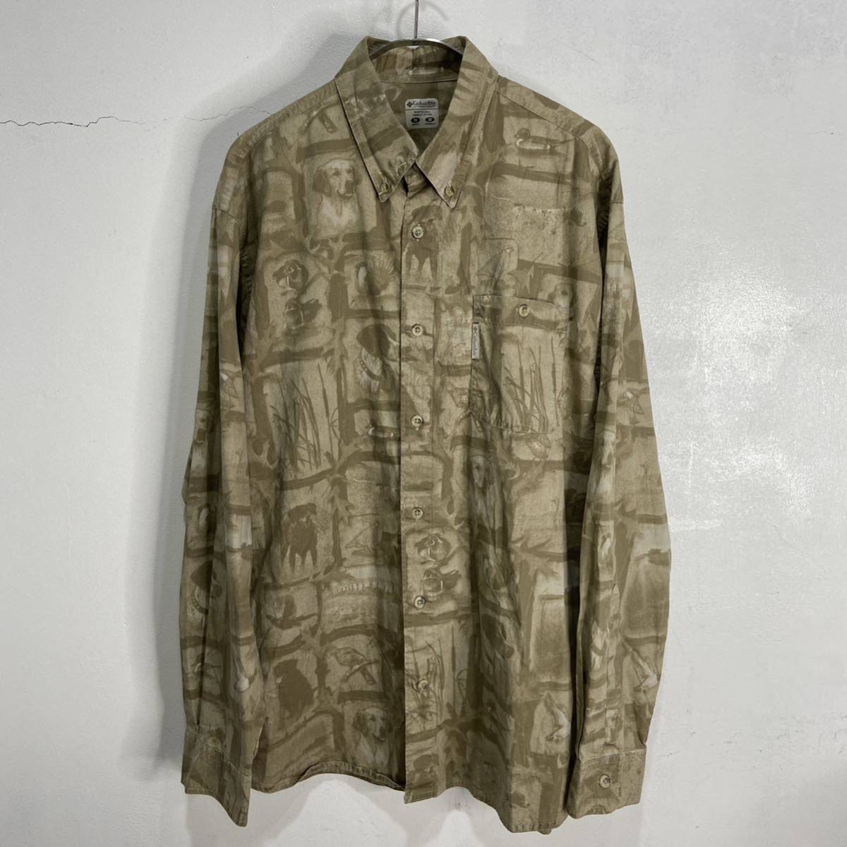 - 送料無料☆Columbia☆PHG☆コロンビア☆総柄ボタンダウン長袖シャツ☆犬☆鳥☆アニマル柄☆カーキ☆M☆K23