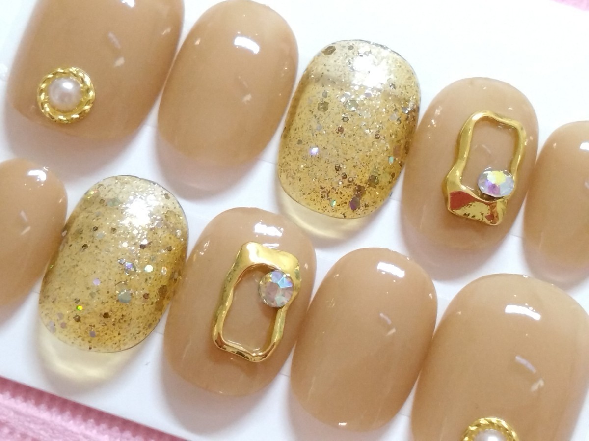 - Lサイズベリーショート・イエローベージュオークルメタリックパーツゴールドアクセントネイルチップ付け爪