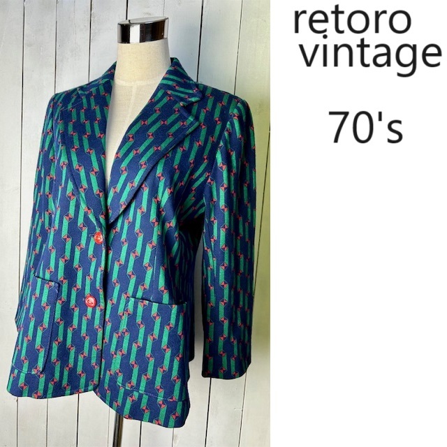 > 昭和レトロ古着 70s 幅広ラペル 総柄ウール系テーラードジャケット 15号 M~L オールド ヴィンテージ 緑×紺 日本製 秋冬春 国産 ●122