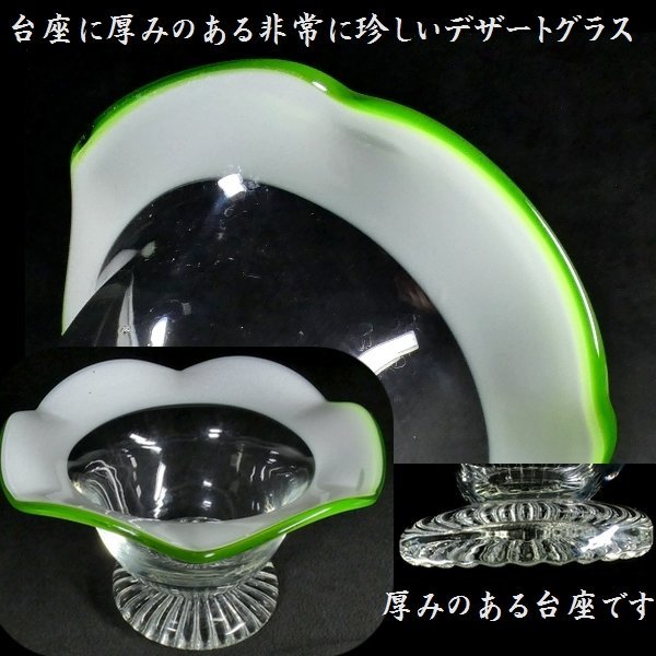 > 【 恵 #0896 】 珍品!台座に厚みのある非常に珍しい造りです! アンティーク 乳白 緑色硝子 輪花型 氷コップ デザートグラス