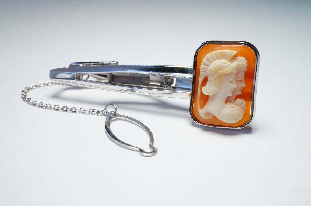 - 【即決特別価格!早い者勝ち】希少!35年前の未使用在庫!珍しいサイズのシェルカメオ付きシルバー製ネクタイバー