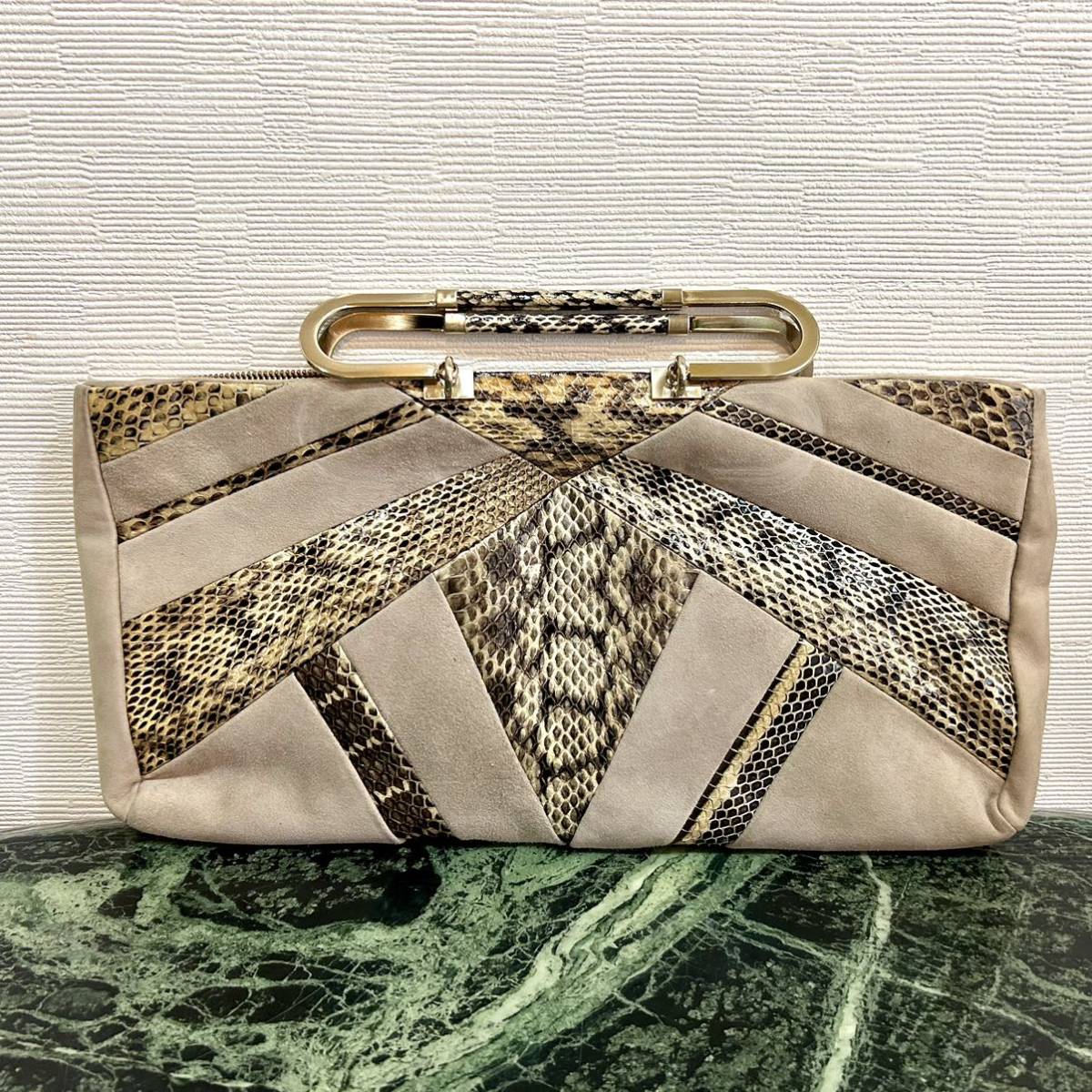 > 【未使用品】HERVE LEGER★エルベレジェ レザーハンドバッグ スエード×ヘビ革 ベージュ スウェード 牛革 パイソン 本革レザー ゴールド