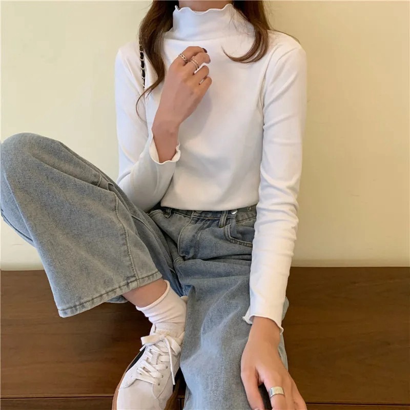 - 送料無料★即納!発熱 タートルネック トップス 薄手 重ね着 フリル 保温 カットソー 可愛い★ホワイト