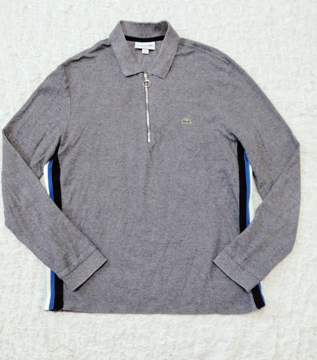 > ラコステ*サイドストライプ*ジップネック*長袖ポロシャツ*グレー*RegularFit*メンズL*ハーフジップ*LACOSTE